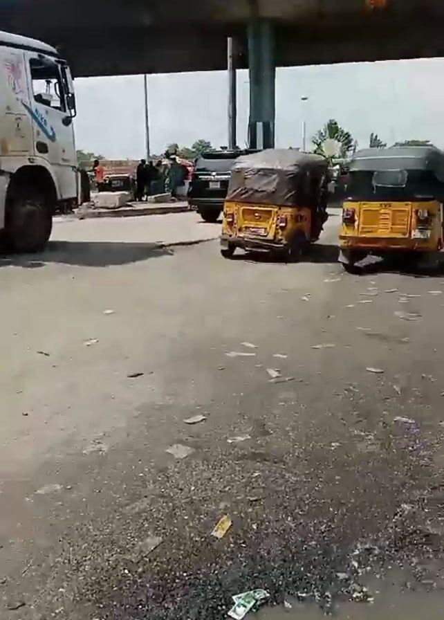 man in a blue shirt walking on a busy road under a concrete overpass. The road is paved but has potholes and litter. Several yellow tricycle taxis, a truck, and other cars are visible in the background. A motorcyclist wearing a green shirt rides past. The man in blue looks back and smiles at the camera. A sign for MSport.com is on the overpass.