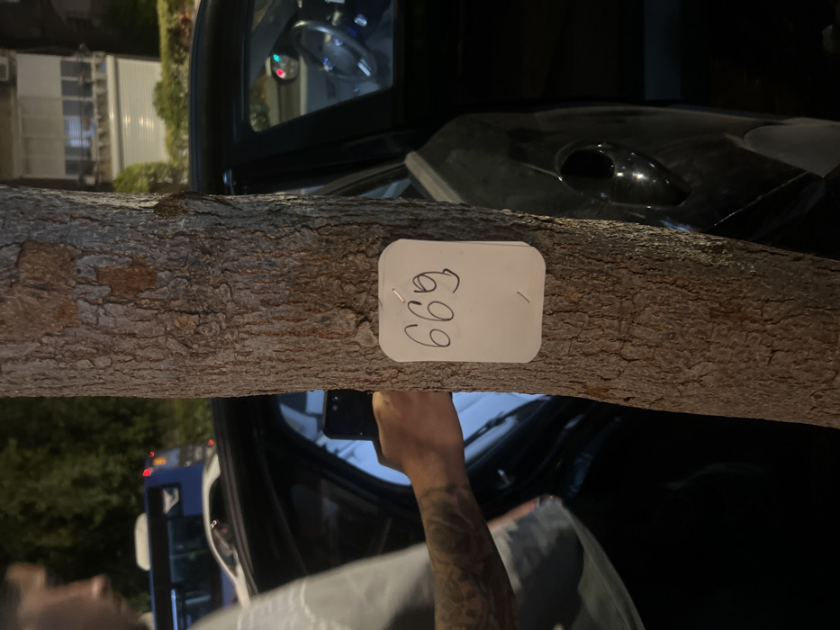 The image captures an urban night scene in Rishon LeZion, Israel. Centrally, a tree trunk stands with a white, rectangular sign affixed by two staples. The sign bears the handwritten number "669" at its top, with an additional, less distinct mark or number below. To the left, a partial view of a male subject is visible in profile, wearing a light-colored shirt. His left forearm is heavily tattooed. He holds a black smartphone horizontally, appearing to record or photograph into the open driver's side door of a dark-colored sedan parked to the right of the tree. The sedan's interior, including the steering wheel, is illuminated. In the background, a blue and white public bus is visible on a street, along with another white vehicle and the facade of a building featuring a roll-down shutter and illuminated windows. The environment is lit by artificial street and building lights, indicative of nighttime conditions.