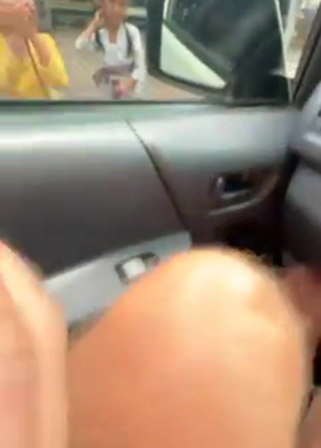 A person in a car is handing pieces of bread to three young girls standing outside the car window. The girls are wearing traditional yellow and brown Balinese clothing. They appear to be thanking the person in the car and waving goodbye as the car moves away. The location appears to be a temple or similar site, based on the traditional Balinese architecture visible in the background.