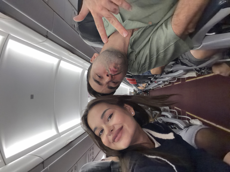 The scene depicts the interior of an airplane cabin, specifically during transit related to Bangkok, Thailand. In the foreground, two individuals pose for a selfie. A female on the left, with long dark hair, smiles directly at the camera. She wears a dark blue sweater with white striped accents and a small stud earring on her left earlobe. To her right, a male with short dark hair and facial stubble pouts his lips while extending his right hand in a "hang loose" gesture. He wears a light green short-sleeved collared shirt. The background shows the aircraft aisle, carpeted in dark red, extending rearward between rows of grey passenger seats. Multiple other passengers are visible seated further down the aisle. Overhead panels with integrated linear lighting illuminate the cabin. A red "EXIT" sign is visible above the aisle in the mid-ground.