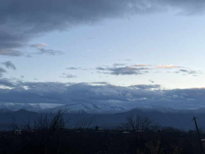 The image presents a wide view of the landscape in Zeda Sakara, Georgia, at what appears to be either dawn or dusk. The sky occupies approximately two-thirds of the frame, featuring a light blue expanse in the upper center, partially obscured by a blend of dark grey and blue-toned clouds. Some scattered, smaller clouds display subtle hints of pink and orange coloration. Below the sky, a prominent mountain range extends across the mid-ground, with multiple peaks visible. Several of these peaks exhibit partial snow coverage, appearing lighter against the generally dark, shadowed slopes of the mountains. The lower third of the image consists of a dark, silhouetted foreground primarily composed of bare deciduous trees and dense brush. Within this foreground, the outlines of multiple low-rise structures, consistent with buildings, are discernible, indicating a rural settlement. A dark wooden utility pole with visible wires stands vertically on the far right side of the frame, extending upwards from the foreground towards the mid-ground mountains. No human figures or specific actions are identifiable within the scene.