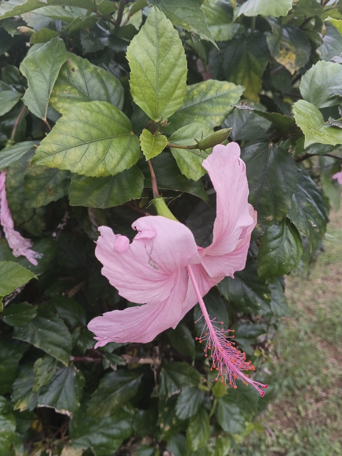 A pink hibiscus flower, the focal point, exhibits delicate petals and a vibrant pink stamen. It's surrounded by lush green foliage with hints of yellowing. A flower bud sits near the top of the image. The background includes a blurred patch of green grass, suggesting an outdoor setting. Overall, the image highlights the natural beauty of the hibiscus.
