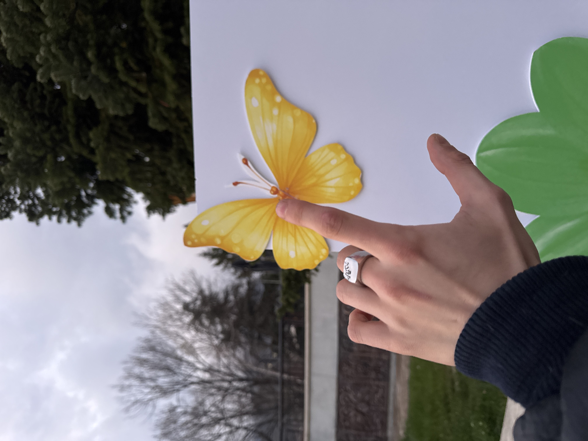 A person's hand wearing a silver ring touches a yellow butterfly sticker attached to a white sign. The sign also has a green flower sticker on it. In the background, there are trees, cloudy sky, and a building. The location appears to be Karlovo, Bulgaria, based on the vegetation, architectural style of the building and the overcast weather conditions which are typical of this location.