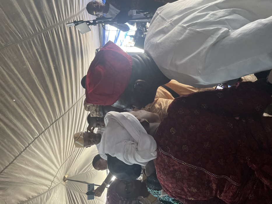 Within a tent, a group of people are gathered