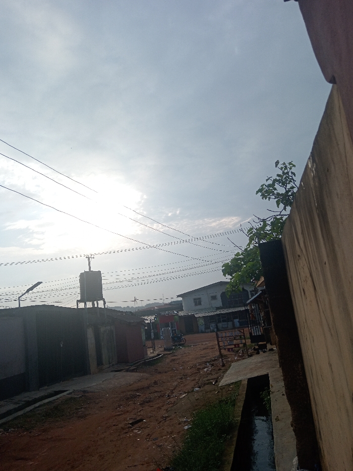 A hazy sky hangs over a street scene. Overhead power lines stretch across the view. A water tower rises above rooftops. A building is partially visible on the right, with some greenery near its top. A narrow drainage ditch runs alongside the road. The street itself appears to be dirt, with structures and shops on either side. A building dominates the right foreground, partially obstructing the view.