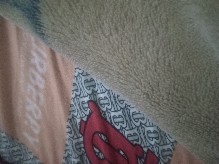 The image presents a close-up view of textured surfaces. A beige, fuzzy fabric dominates the right side, contrasting with a patterned textile below. The pattern features a repeating "B" motif in white against a gray background, intertwined with a bold red design element. Part of a peach-colored fabric with the word "BURBERRY" is visible to the left. The textures create a cozy and layered feel.