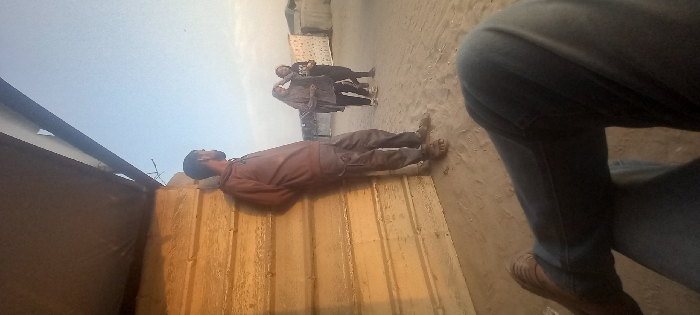 The image depicts an outdoor scene in Khan Yunis, Palestinian Territory, captured from a low vantage point. In the immediate foreground, the crossed legs of an individual wearing blue jeans and brown shoes are visible, indicating the photographer's seated position. To the left, a man with a beard, dressed in a brown hooded sweatshirt and dark cargo pants, stands leaning with his back against a light-colored, horizontally paneled structure, possibly corrugated metal or wood. He is wearing dark sandals and looking towards the right side of the frame. Above him, a dark, flat overhead canopy or roof is visible, supported by a metal beam. The ground across the entire scene is composed of light brown, dusty sand or packed earth. In the mid-ground, beyond the standing man, three other individuals are present. One person wears a grey, textured head covering and garment, standing with hands near their face. Beside them, another person in dark clothing is partially visible. A third person, also in dark attire, stands further back. These individuals appear to be observing or casually present in the open, sandy area. In the background, faint outlines of makeshift structures or tents are discernible under a pale blue sky, consistent with a temporary settlement or camp environment.
