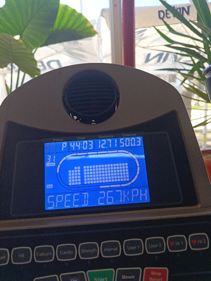 The primary subject is a fitness machine console, likely from a treadmill or elliptical, displaying workout metrics on a blue-backlit screen