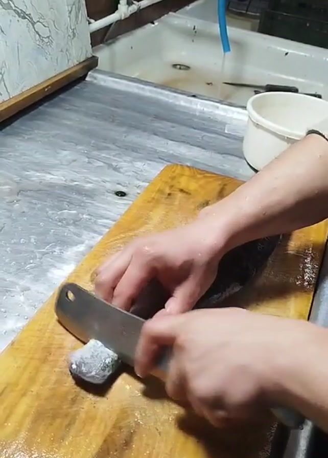A person is using a knife to scale a fish on a wooden cutting board. The fish has dark skin with a silvery sheen, and it is lying on its side. The person's hands are visible as they hold the knife and manipulate the fish. The knife is a large, flat-bladed cleaver-style knife. The cutting board is rectangular and shows signs of use, with cut marks and discoloration. In the background, there is a stainless-steel sink with a faucet running, and a white plastic bucket nearby. A section of the wall above the sink is covered with patterned tiles. The countertops are gray and appear to be made of a material like marble or concrete.
