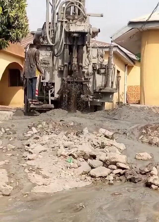 A man operates a large drilling rig on a muddy, rock-strewn patch of land in what appears to be a residential area