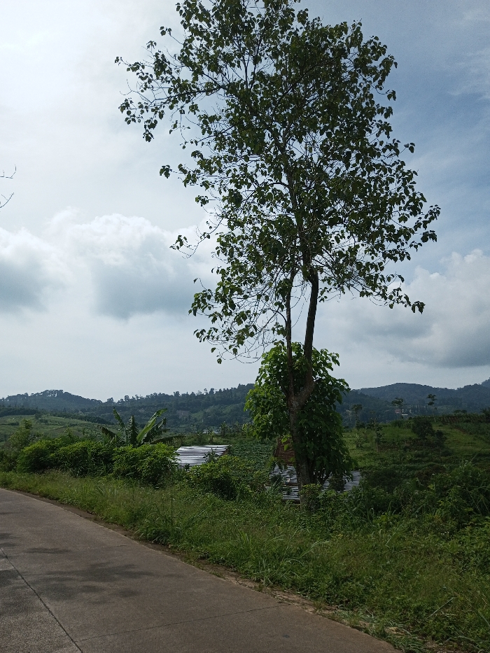 The scene depicts a rural landscape in Matale, Sri Lanka. A gray paved road is visible in the lower left quadrant, extending diagonally upwards. Dominating the right-center is a tall tree with a prominent bifurcated trunk and dense green foliage. To the right of the road and around the base of the tree is an expanse of unmanaged green grass, shrubs, and other low-lying vegetation. In the midground, partially obscured by the foreground vegetation, a structure with a reflective corrugated metal roof is visible. To its right, behind the main tree, a second structure with a reddish-brown roof is discernible. Several banana plants are identifiable among the greenery to the left of the main tree. The background consists of undulating green hills, densely covered with trees, beneath a sky with mixed blue patches and numerous white-gray clouds. No individuals or specific actions are observed within the frame.