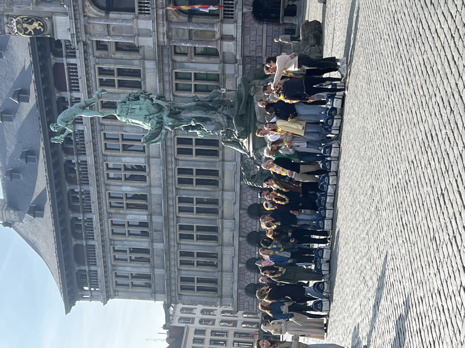 A group of 20-25 individuals stands on a cobblestone plaza in Grote Markt, Antwerp, Belgium