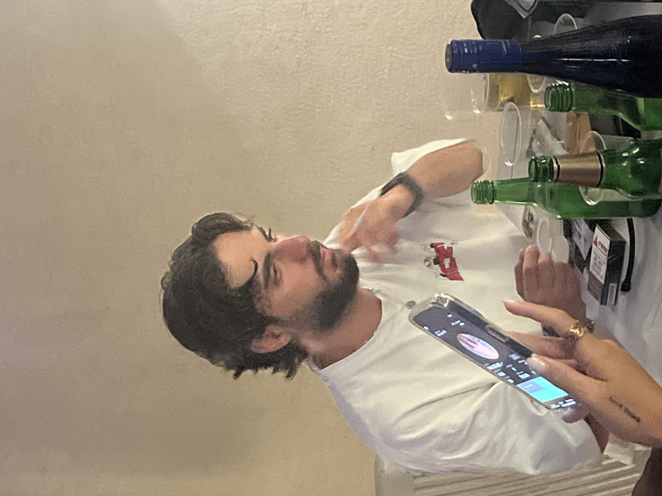 The scene depicts an indoor social gathering in Rishon LeZion, Israel. A male individual is seated at a table, positioned slightly left of center. He has dark, wavy hair, a trimmed beard, and mustache. He wears a white t-shirt with a red graphic, a light blue pendant necklace, and a dark smartwatch on his left wrist. His right hand is raised, holding a thin, white object. He is looking downwards and to his right. A partial view of a second person's left hand is visible in the lower-left, holding a smartphone with a clear case displaying a pie chart. This hand features manicured nails, a gold-colored ring on the ring finger, and a tattoo on the inner forearm. The table is covered with a white surface and holds multiple objects: a black pack of cigarettes, several green glass bottles (some empty), a blue glass bottle, clear plastic cups, and at least one clear glass tumbler containing an amber liquid. A white slatted chair back is visible behind the male subject. The background consists of a plain, light-colored wall. Artificial lighting illuminates the scene.