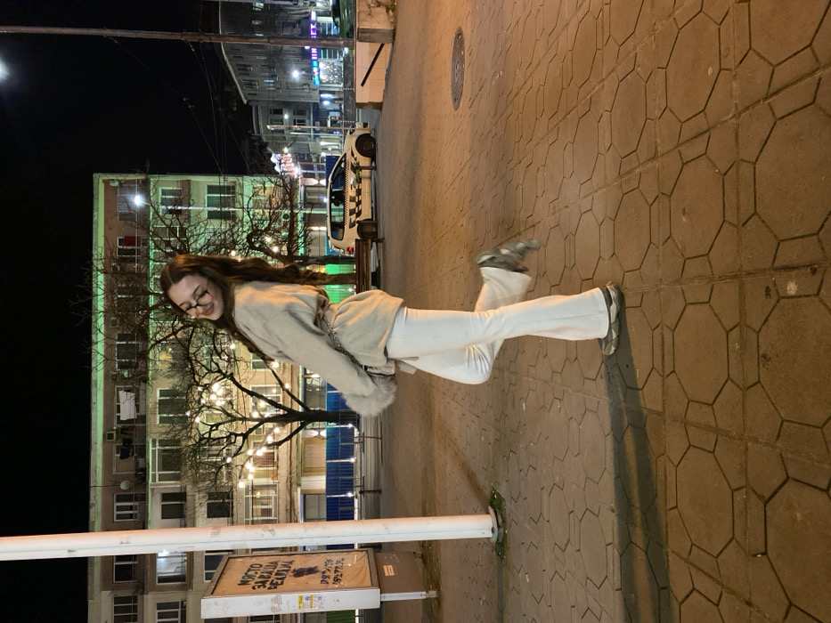 This nighttime image depicts a young adult female on a paved sidewalk in Varna, Bulgaria