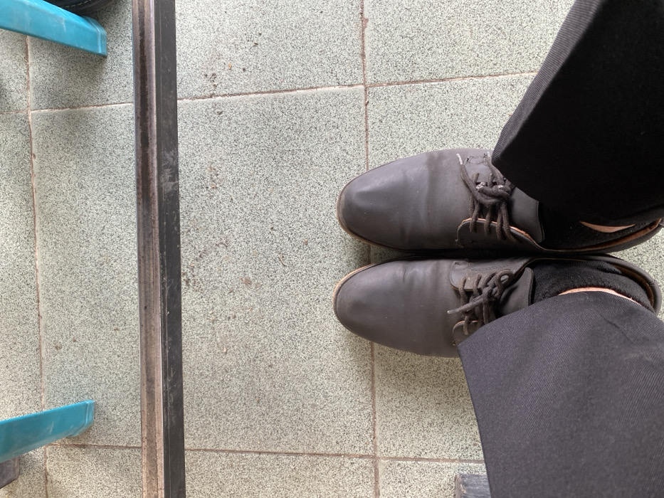 The image depicts a top-down view of a person's lower legs and feet on a tiled surface in Surien, Indonesia. The person wears dark grey or black lace-up shoes with lighter-toned soles, black socks, and black trousers. A dark, possibly metal, horizontal bar is positioned across the upper portion of the frame, and a partial light blue plastic object is visible in the top-left corner. The floor consists of light grey-green speckled tiles with visible grout lines, showing minor wear and dirt accumulation.