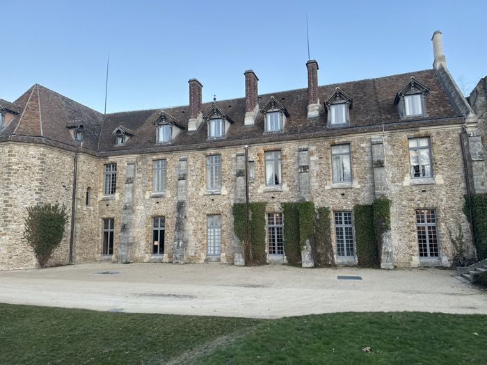 A multi-story stone building under a tiled roof fills the frame. It features arched windows and dormers. Vines climb up the facade. Chimneys extend from the roof. A small bush sits to the left side. The building sits on a gravel ground, which transitions to a grassy area in the foreground. A clear sky serves as the backdrop.