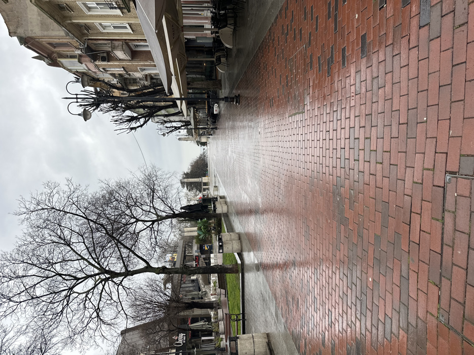 The image displays a wide, wet pedestrian boulevard, identified as Knyaz Boris I Boulevard in Varna, Bulgaria, under an overcast sky. The ground is predominantly paved with reddish-brown bricks, interspersed with darker grey sections, and is visibly wet and reflective, indicating recent precipitation. A rectangular metal grate is visible in the foreground pavement. No individuals are present in the scene. On the left side of the boulevard, a green grassy median separates the main walkway from commercial establishments. This area contains dark wooden benches and concrete planters. Several large deciduous trees, bare of foliage, with dark trunks and intricate branching, are prominent. Behind these trees, a building with a dark, modern facade and large windows is visible, featuring a sign that reads "Cherry." Further down the boulevard on this side, classical-style stone pillars or archways are discernible. On the right side, a continuous row of multi-story buildings lines the street. These structures exhibit varying architectural styles and paint colors, including beige, pink, and light brown, with some featuring balconies. Numerous outdoor seating areas for cafes and restaurants occupy the pavement, equipped with beige retractable awnings or large umbrellas, several of which display "Costa" branding. Underneath these coverings, tables and chairs are neatly arranged but unoccupied. Black, ornate streetlights with multiple lamps are spaced along this side, interspersed with bare, pruned deciduous trees. The sky is a uniform, heavy grey, consistent with overcast weather conditions. The boulevard extends into the distance, appearing deserted, with a hazy horizon visible at the far end, suggesting the direction towards Varna's Sea Garden or the Black Sea.