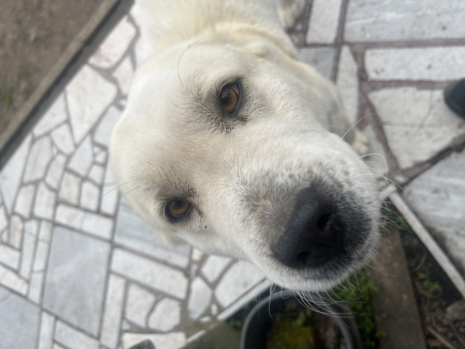 - "The image displays a close-up, high-angle view of a light-furred dog, likely a Labrador Retriever or similar breed, situated in Poibrene, Bulgaria" by FM-YrvG92, licensed under CC BY 4.0