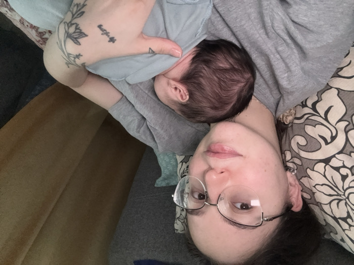 In Chaikovsky, Russia, an adult female is depicted in a close-up, selfie-style photograph, holding an infant. The woman, with dark hair and cat-eye eyeglasses, is looking directly at the camera with a neutral expression. She wears a grey t-shirt and a small, decorative earring in her left ear. Her right forearm and hand display multiple tattoos, including a floral design and script. The infant, with dark hair, is visible from the back of its head and shoulder, resting against the woman's left side, clad in a light blue garment. The background reveals an indoor setting, with a patterned pillow to the left of the woman, and draped brown fabric visible to the right.