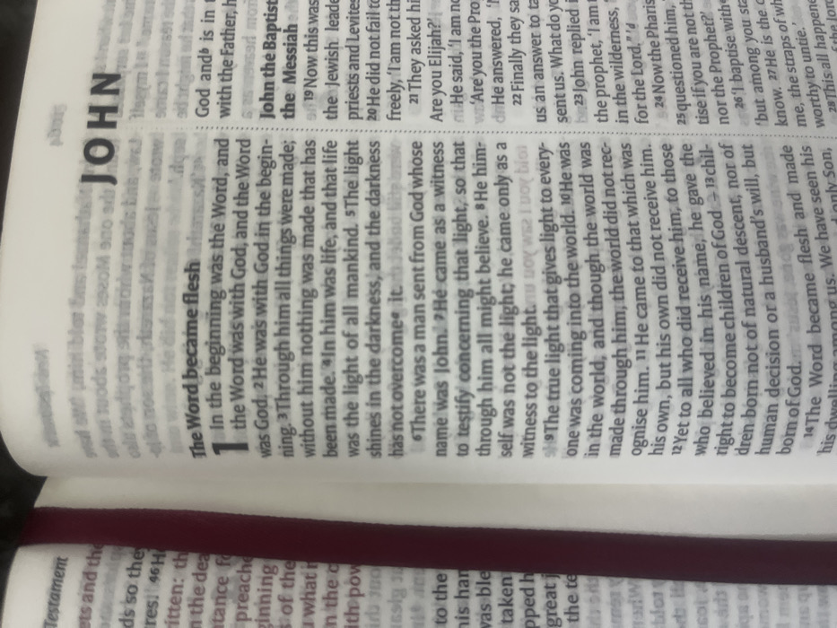 This image depicts a close-up, overhead view of an open English-language Bible, situated in Gitothua ward, Kenya. The right page prominently displays the title "JOHN" in bold black capital letters at the top, with the heading "The Word became flesh" visible below it. The visible text includes the beginning of John Chapter 1, starting from verse 1, "In the beginning was the Word, and the Word was with God, and the Word was God," and continues down to approximately verse 14. A partial right-hand column on the same page shows text under headings such as "John the Baptist" and "the Messiah," with numbered verses visible from 19 onwards. The partially visible left page displays text, with the word "Testament" discernable at the top left. A dark red or maroon ribbon bookmark is positioned vertically along the inner spine of the left page. The pages are white with clear black text. The scene is well-lit, suggesting an indoor environment. No individuals, actions, or direct interactions are visible within the frame.