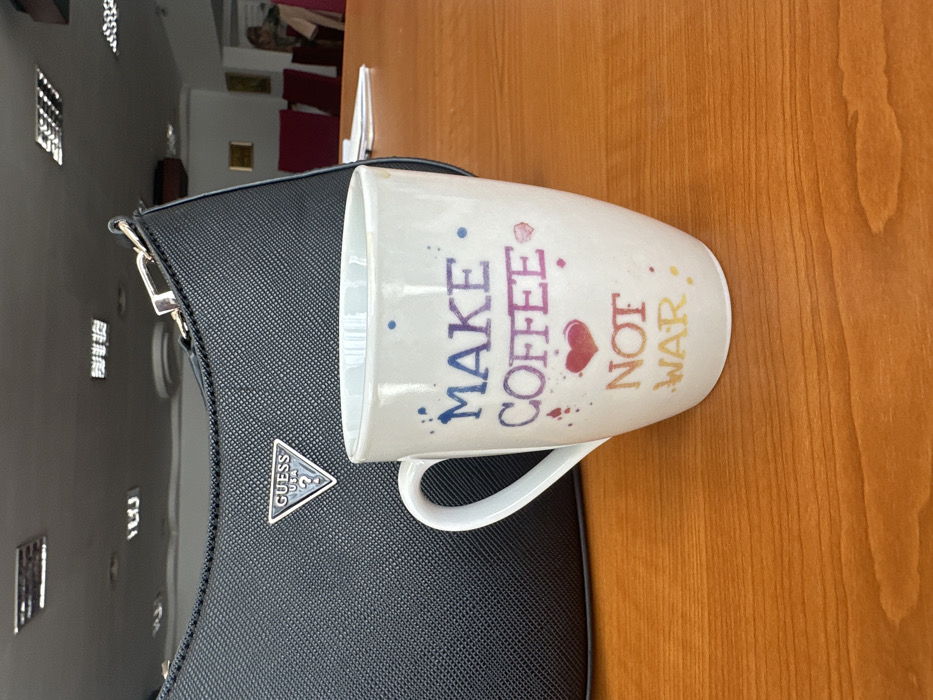 The scene is located in an indoor setting within the city of Horezu, Romania, likely a meeting or office room. A white ceramic mug, emblazoned with the text "MAKE COFFEE" (in blue and purple gradient), a red heart icon, and "NOT WAR" (in orange and yellow gradient), along with colorful paint splatters, rests on a polished, reddish-brown wooden table. Behind the mug and slightly to its left, a black, textured handbag with a metallic "GUESS USA" triangular logo is positioned. Overhead rectangular light fixtures are reflected on the handbag's surface and in the distant background. In the background, red upholstered chairs are partially visible, and a light-colored wall displays at least two framed items. White papers are also present on the table to the right of the mug. A single individual is indistinctly visible in the far right background, partially obscured by the distant furniture. No direct actions or interactions are depicted.