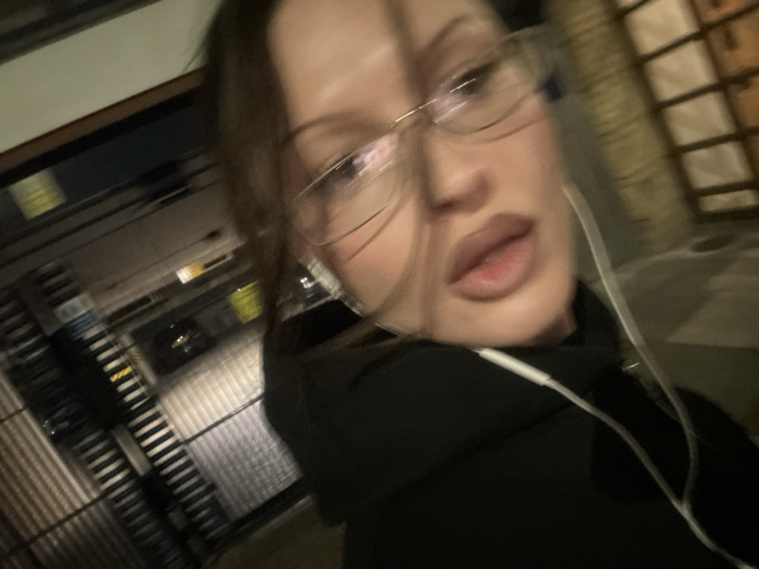 The image presents a close-up, tilted selfie of an individual in an urban environment at night within the city of London, United Kingdom. The subject, appearing to be female, is centered in the frame, looking towards the camera with a neutral expression and slightly parted lips. She wears gold-rimmed eyeglasses and has brown hair. A white wired earphone with an earbud is visible in her left ear, with the cable extending down the front of a black hooded garment. The background is heavily motion-blurred and indistinct due to low light, depicting elements consistent with a street or alleyway. Faint light sources, possibly streetlights or building illumination, are visible in the background, along with blurred architectural features that suggest building facades with horizontal structures. No specific landmarks are discernible.