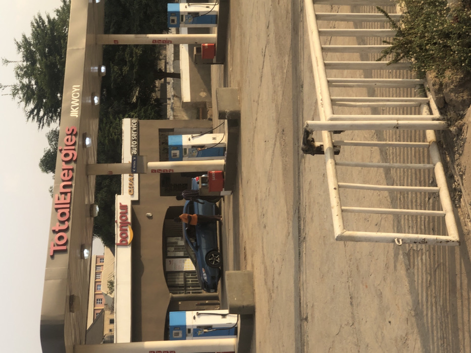 A TotalEnergies station is pictured, with a blue car parked at a pump. A person in an orange shirt stands beside the vehicle, possibly refueling. The station features a "bonjour" sign and offers auto service. A white metal ladder is situated beside the gas station on the concrete. Some shrubbery can be seen next to the ladder.