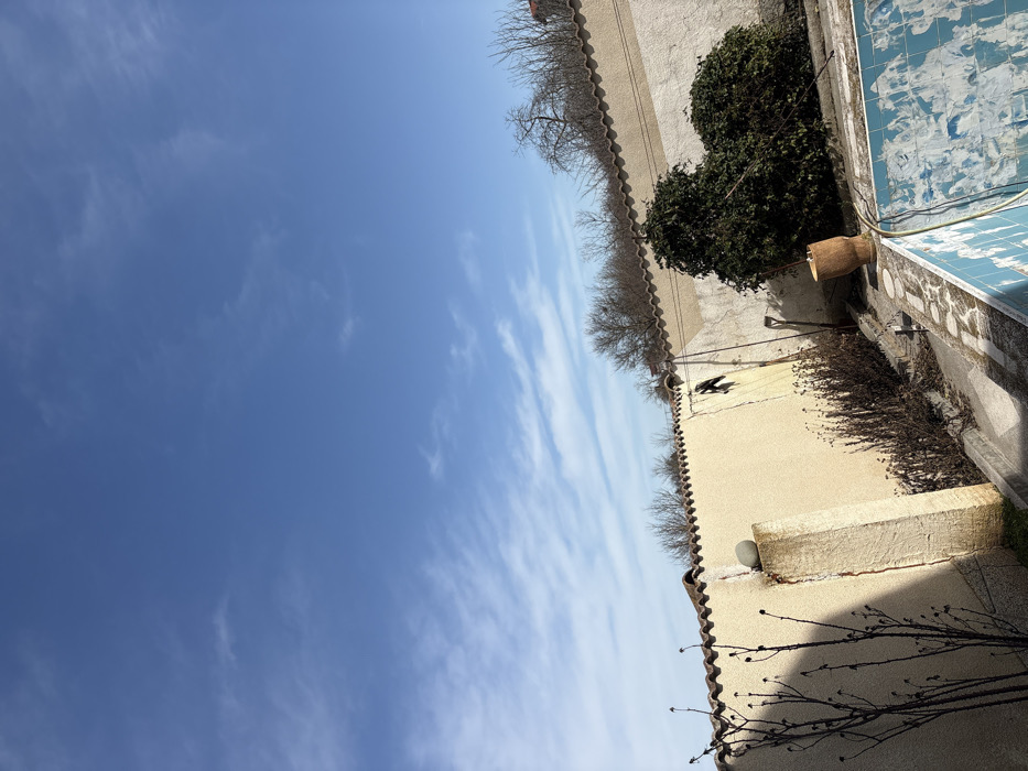 The image displays an outdoor residential or garden area in Stefan Karadja, Bulgaria, under a clear blue sky sparsely populated with thin, white cirrus clouds. In the foreground, the perimeter and interior of an empty swimming pool are visible, characterized by peeling and discolored light blue tiles. A green hose rests on the pool's edge in the lower right. A large, light brown, urn-shaped clay pot is positioned near the pool's edge, left of center. A cream-colored stucco perimeter wall, topped with a wavy terracotta coping, extends across the mid-ground. This wall shows signs of weathering, including a vertical crack or discoloration on its left segment. A square concrete pillar with a rounded cap, appearing to be stuccoed, stands prominently on the left side of the wall. A small, dark, dome-shaped object is affixed to the top of this pillar. To the left of the pillar, a bare, dark-branched shrub or small tree rises. Along the base of the wall, between the pillar and a dense, dark green evergreen shrub on the right, lies a stretch of dry, dormant vegetation. A black-handled shovel and another long-handled tool are leaning against the wall in a recessed area towards the center, where a small, dark object is suspended from a wire or fixture. Beyond the wall, a line of bare deciduous trees is visible, with hints of distant structures or elevated terrain. The scene is illuminated by strong natural sunlight, creating distinct shadows.