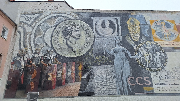 This image depicts a large, multi-panel historical mural painted on an exterior building wall in Szombathely, Hungary. The mural spans the full width of the visible wall and extends from near ground level upwards, concluding beneath a weathered rooftop line against an overcast sky. On the far left, a segment of an adjacent light-colored building with a rectangular window is visible. The mural itself is a composite of various historical scenes and artifacts. In the lower-left quadrant, five Roman soldiers, clad in segmented armor and helmets, stand in a line, each holding a rectangular *scutum* (shield) with central boss detailing. Behind them and extending upwards, a large circular pattern resembles a mosaic or ornamental design. Above the Roman soldiers and slightly to the right, a prominent circular depiction of a Roman coin features a right-facing bust of an emperor adorned with a laurel wreath, with partially legible Latin text "CLAUDIUS AVG IMP T..." around its periphery. To its right, a rectangular relief panel portrays a male bust in profile. Further right, a grey-toned female figure, resembling a classical statue in a toga, stands facing right, holding a slender staff or scepter in her raised right hand. Her left arm is slightly extended. Below her, the capital letters "CCS" are visible. Above this female figure, a bearded man with a golden miter and robes, likely a bishop or religious figure, is depicted. To the upper right of this figure, a stylized "S" letter encloses a seated figure on a patterned background. Below the bearded man, another circular depiction, similar to a medieval medallion or seal, shows multiple figures, one appearing to be on horseback, with an illegible circular inscription. In the lower-right quadrant, below the "CCS" text and the circular medallion, a monochrome illustration of a historical city plan or landscape is visible, with some accompanying text. A cobblestone path or road segment is depicted leading from the lower center towards the mid-ground, beneath the female figure. The entire mural is rendered in a detailed, somewhat faded style, suggesting age or a deliberate aesthetic choice.