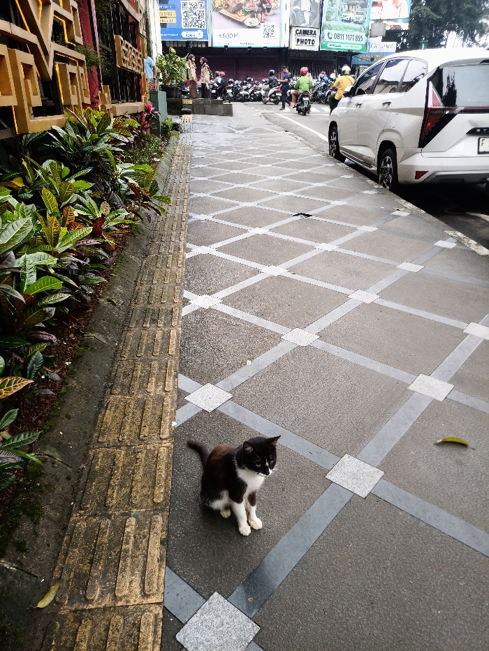 A black and white cat sits on a patterned sidewalk. The sidewalk is gray with squares and light gray diagonal lines, adjacent to a textured yellow border and plants. A white car is parked on the right side of the frame. Further back, motorbikes and people are visible in front of buildings and advertisements. The scene appears to be outdoors on a slightly wet day.