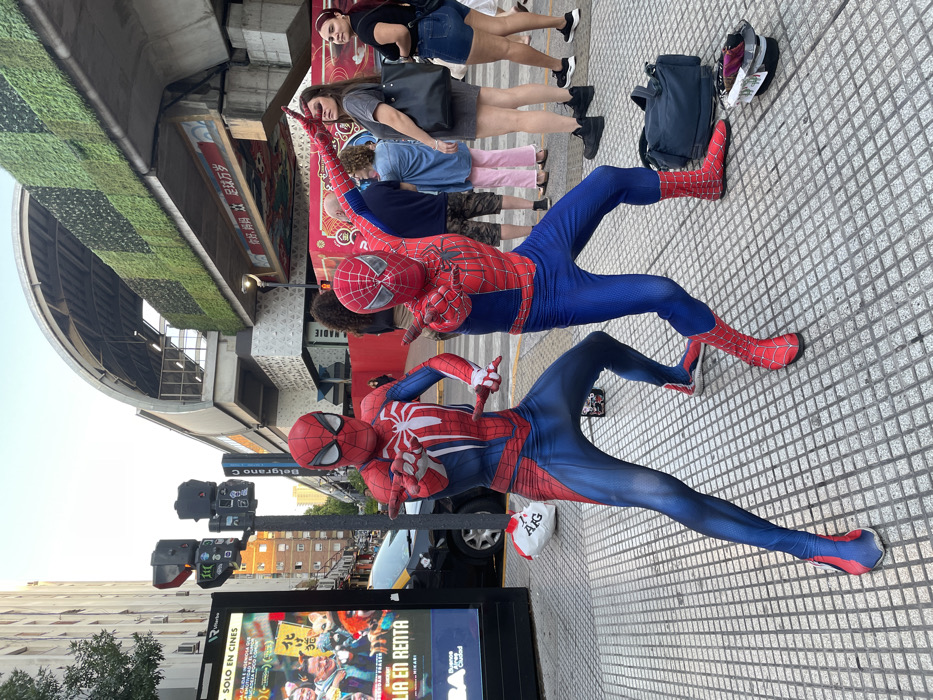 - "Two individuals dressed in Spider-Man costumes pose on a city sidewalk" by FM-BT1Sm1, licensed under CC BY 4.0