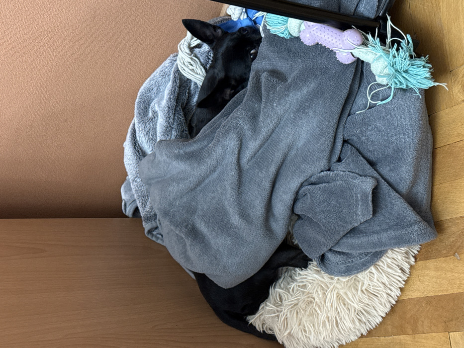 The image displays an indoor scene in Cherven Bryag, Bulgaria, specifically a corner defined by a light brown wooden furniture surface on the left and a textured, reddish-brown wall on the right. A small, black dog is observed resting on a cream-colored, shaggy circular mat, partially covered by a pile of grey blankets. The dog's head, with prominent pointed ears and partially open eyes, is visible, positioned on the light grey blanket. To the right of the dog, near its head, loose light blue yarn-like material is present. Further to the right, a purple, textured, bone-shaped dog toy with light blue string tassels lies on the wooden floor, leaning against a dark vertical element, possibly a furniture leg or frame. The floor consists of light brown wooden planks.