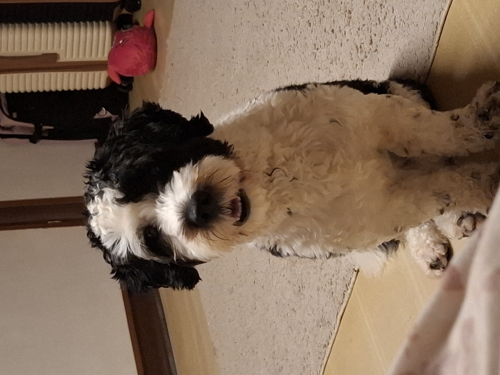 - "A black and white shaggy-haired dog is seated upright on a light beige textured rug, facing directly towards the viewer" by FM-sRAJo1, licensed under CC BY 4.0