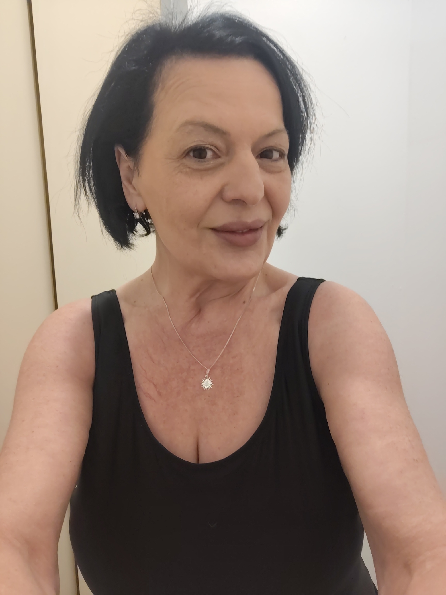 A single female individual is depicted in a close-up, head-and-shoulders portrait within an indoor setting in Souffelweyersheim, France. The subject appears to be middle-aged, with short, dark hair and a fair complexion. She is directly facing the camera with a subtle, closed-lip smile. Her attire consists of a black, scoop-neck sleeveless top. She wears a silver-colored chain necklace featuring a sunburst-shaped pendant with a central circular element. Silver-colored dangle earrings, each adorned with multiple small, clear geometric elements, are visible on both ears. Her skin shows scattered freckles and a faint reddish mark on the upper left side of her chest. The background comprises plain, light-colored walls, with a vertical seam or edge, possibly from a doorframe or cabinet, visible on the left side of the frame. The lighting is even and bright. No interactions with other subjects are visible.