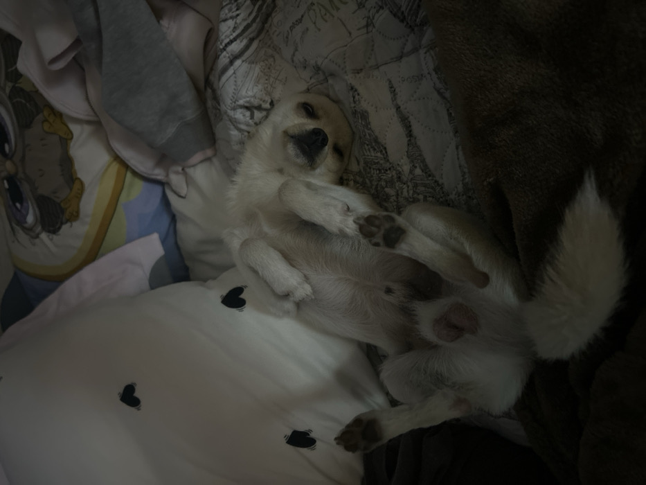 - "This image depicts a light-furred male dog lying on its back in a supine position, suggesting sleep or deep relaxation, within an indoor domestic setting in Dinkovitsa, Bulgaria" by FM-Caix72, licensed under CC BY 4.0