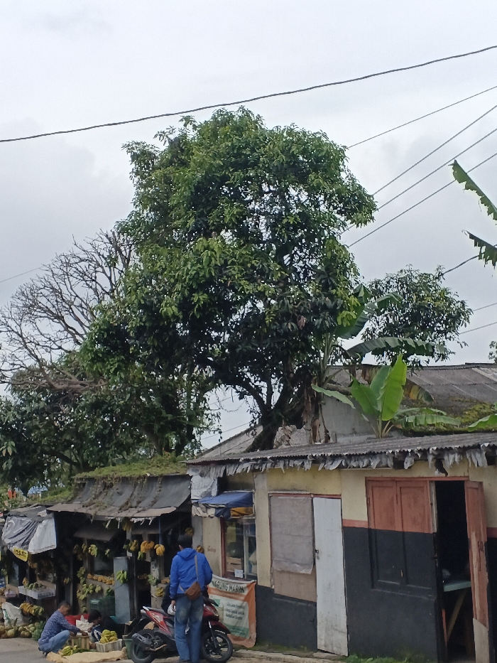 The image depicts an outdoor street scene under an overcast sky, characterized by tropical or subtropical elements. While the requested location is Шчыткавіцкі сельскі Савет, Belarus, visual cues such as the type of vegetation and architecture are inconsistent with this region, suggesting a Southeast Asian locale. Three individuals are present in the scene. In the mid-ground, a male subject wearing a blue long-sleeved shirt, blue jeans, and a brown shoulder bag stands facing away from the camera, positioned next to a red and black motorcycle parked on an unpaved surface. To the left, two other individuals are seated on the ground, interacting with piles of large yellow-skinned fruits, potentially durians or jackfruits, displayed within makeshift market stalls. One seated individual wears a light blue shirt. The background consists of several structures. On the right, a single-story building with a corrugated metal roof features a two-tone paint scheme of light yellow-beige above and dark gray/black below. It has a white, partially open door, a window covered by a light material, and a closed dark wooden door. A white banner with black and green text, including "AGUNG MASRI," is partially visible on its exterior wall. To the left of this building, a series of open-front market stalls are constructed with corrugated metal roofs, some exhibiting moss and tattered edges. These stalls prominently display numerous yellow fruits, both hanging and stacked. Vegetation is abundant. A large, dense green tree dominates the upper center, its foliage extending above the roofs. A bare-branched tree is visible further left in the background. Several banana plants with large green leaves are growing on and around the corrugated roof of the rightmost building. Overhead, multiple power or communication lines stretch across the uniformly gray, cloudy sky.