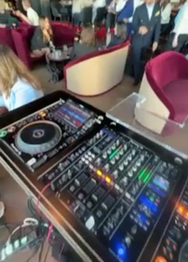 DJ setup in a high-rise venue, likely a bar or lounge, overlooking a cityscape