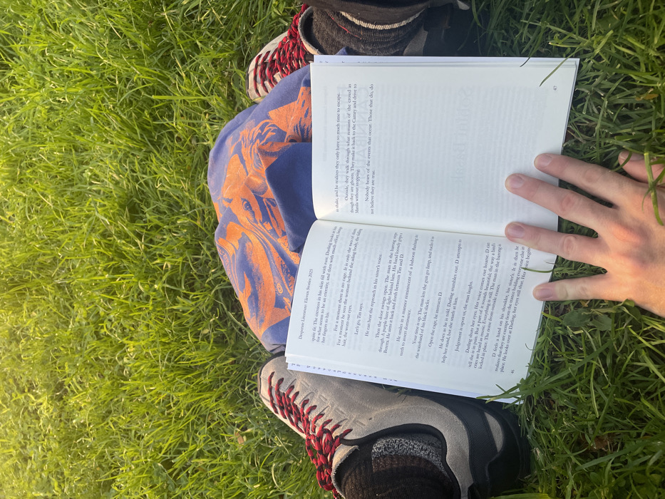 The image presents a downward-angled view of a person seated on vibrant green grass, engaged in reading