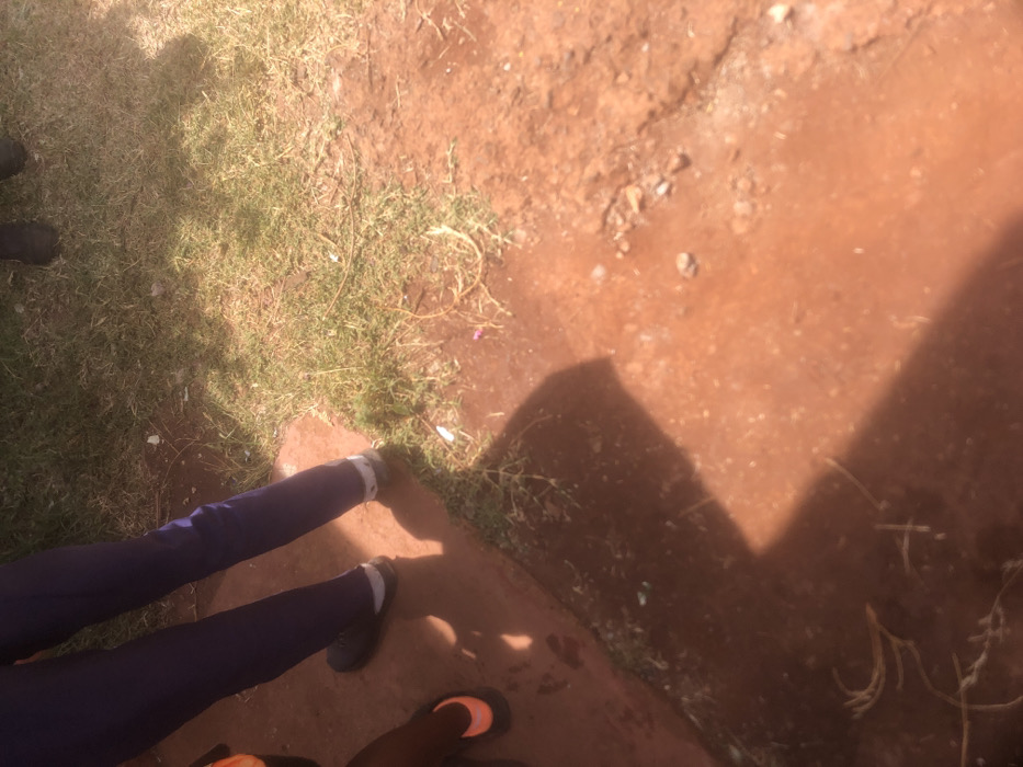 The image depicts a ground-level view in Ngong ward, Kenya, illuminated by bright daylight casting distinct shadows. The foreground and midground consist of reddish-brown soil, partially wet in some areas, containing small stones and sparse plant debris. To the left, the lower legs and feet of two individuals are visible. One person wears dark blue trousers, dark shoes with white socks, and stands on the reddish soil. Adjacent to them, another person's lower left leg and foot are partially visible, wearing a dark shoe with a distinct orange sole. Patches of green grass are present on the right side of the frame and bordering the soil. Multiple dark shadows, consistent with human figures, are cast prominently across the reddish-brown ground, indicating the presence of additional individuals or the angle of the sun relative to the subjects. No specific actions or interactions are discernible beyond standing.