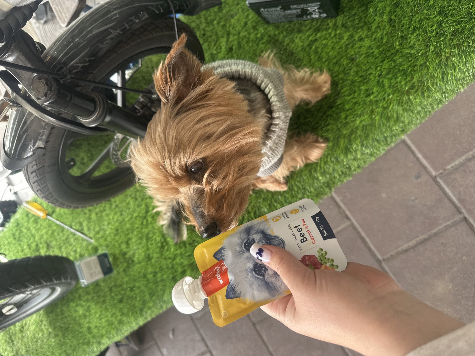 A medium shot, taken overhead, shows a Yorkshire terrier in a gray sweater sitting on artificial green grass, looking towards a hand holding a yellow pouch of "Wahpy" brand dog food, featuring "Beef, Carrot & Pea" flavor, with an image of a cat on the front. The hand has a nail with a white base and a black heart design. To the left, the front wheel of a small electric bike is visible, along with a yellow-handled screwdriver. In the background, a black rectangular object is partially visible. The ground transitions to a tile surface in the lower right corner. Based on image metadata, the location is Ramat Gan, Israel.