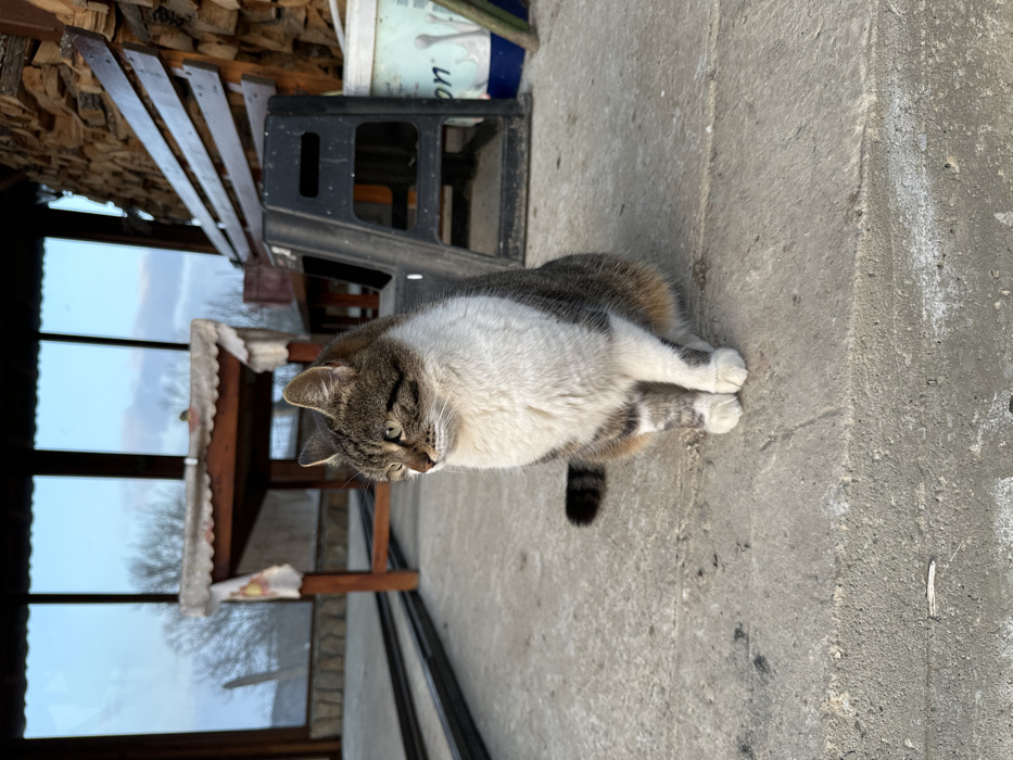 An adult domestic cat, exhibiting a tabby pattern with white fur on its chest, belly, and paws, sits on a weathered concrete surface. The cat faces left, its head slightly elevated, with its gaze directed towards the upper left of the frame. Its tail is partially visible behind its right hind leg, displaying dark tabby stripes. The cat is positioned in what appears to be a semi-enclosed outdoor area, likely a veranda or sunroom, within the city of Pobit Kamak, Bulgaria. In the immediate background to the left, a series of large glass panels or windows reflect a clear, light-blue sky with faint cloud formations and the silhouettes of bare trees. Below the windows, two parallel dark metal bars or frames rest horizontally on the concrete floor. Towards the center-left background, a wooden table with a light-colored, possibly embroidered, tablecloth is visible. To the right of the table, a wooden bench with multiple slats extends horizontally. Below the bench and to the right of the cat, a black plastic stool or step is present. Further right, a white plastic bucket with blue writing and design elements, possibly a paint or construction material container, sits on the concrete. Several thin, green-brown sticks are propped against the bucket. The background on the far right features a neatly stacked wall of firewood. The scene is illuminated by natural light, casting soft shadows. No human figures are present.
