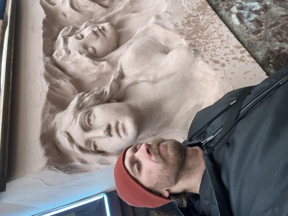 A male subject with a light brown beard and mustache, wearing an orange knit beanie and a black hooded jacket, stands in front of a large architectural relief sculpture