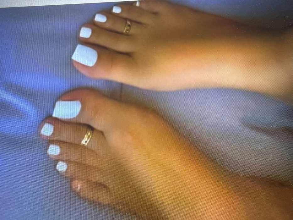 The image displays a close-up, overhead perspective of two human feet resting on a light blue or lavender textile surface. Both feet exhibit a fair to medium skin tone. The toenails on the first four digits of the left foot and all five digits of the right foot are painted with a uniform light blue or white polish. The fifth (little) toenail of the left foot appears unpainted or has a natural-toned polish. The second toe of the left foot bears a thin, gold-colored toe ring. The second and fifth toes of the right foot each carry similar thin, gold-colored toe rings. The feet are static, with no discernible actions or interactions occurring. The background fabric is softly wrinkled. The visual information within the image does not provide any details to ascertain a specific geographical location, including Plovdiv, Bulgaria. The image itself shows characteristics consistent with a photograph of a digital screen, evidenced by a subtle pixel grid pattern.