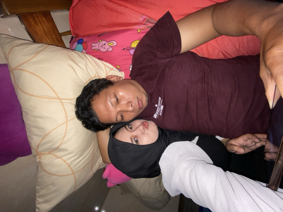 A selfie shows a couple lying on a bed with pillows. The man, wearing a burgundy t-shirt, rests his head on a light brown pillow. The woman, wearing a black hijab and a white shirt, leans her head on the same pillow, looking at the camera with puckered lips. A purple pillow and a pink cushion are visible near the heads. Other pillows with cartoon designs are near the top edge of the frame. Part of a wooden structure is seen at the top left. A hand holding a cell phone is near the upper right.