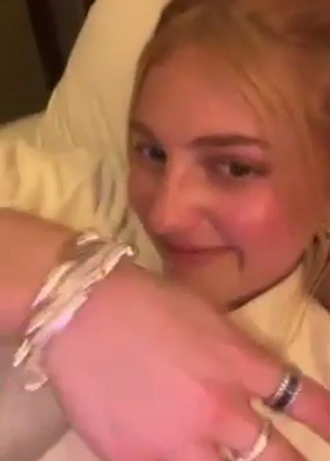 young woman with blonde hair lying on a bed, presumably in a bedroom. She is wearing a white shirt or robe. She holds up her wrist to the camera, showing a bracelet made of what appears to be crumpled white tissue or paper. She grimaces at the camera and then looks away. The background is blurred, but appears to be a dark-colored wall and a white pillow. The lighting is dim.