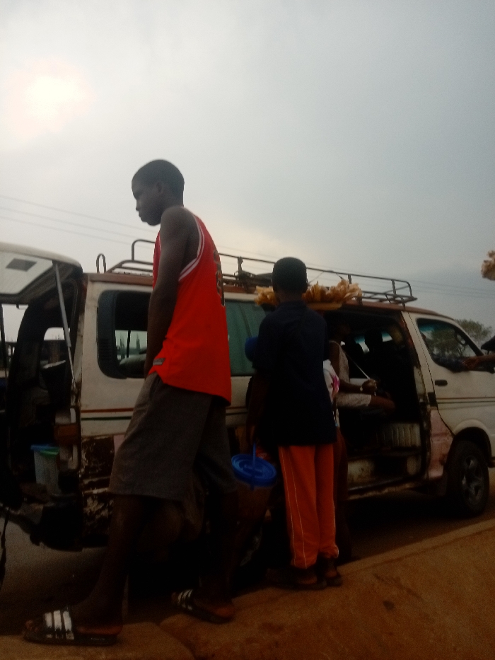 Two people stand next to a white and brown van, likely a taxi or public transport vehicle. The person on the left wears a red basketball jersey, gray shorts, and Adidas sandals. The second person is wearing a dark jacket and orange pants. The van is full of people and has corn on the roof. The weather seems cloudy or overcast. The vehicle appears to be in poor condition.