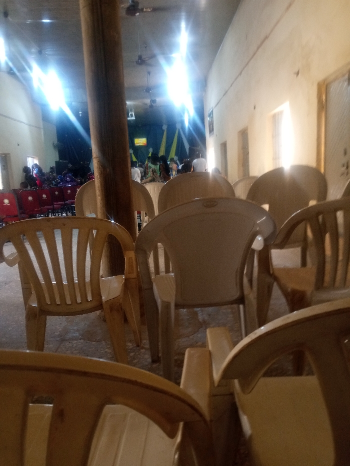 Rows of plastic chairs occupy the foreground, casting shadows on the floor. A large wooden post rises amidst the chairs, partially obstructing the view. In the background, people are seated or standing near a stage with a screen and draped fabric. Bright lights glare from the stage area. The walls are painted in light colors, and windows are visible along the side. Ceiling fans are noticeable overhead.