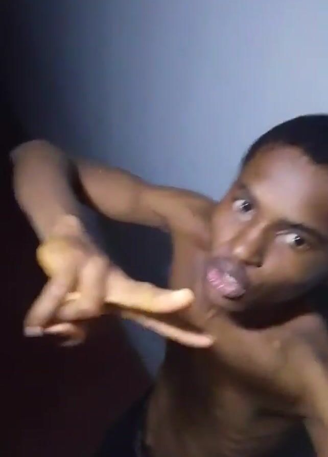 shirtless young man with short dark hair and dark eyes posing in front of a light gray wall. He is making faces at the camera, sticking his tongue out, and posing with his hands. At the end of the video, he leans toward the camera, making his face fill the frame.