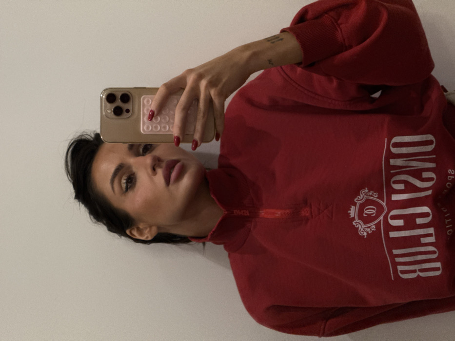 A young woman with dark hair and red nails takes a selfie, holding a tan iPhone with a pink bubble grip on the back. She is wearing a red quarter-zip sweatshirt with a white "Classic Club" logo on the front. She is facing the camera with a slight pout. A tattoo is visible on her left forearm. The background is a plain, light-colored wall. The image is rotated counter-clockwise.