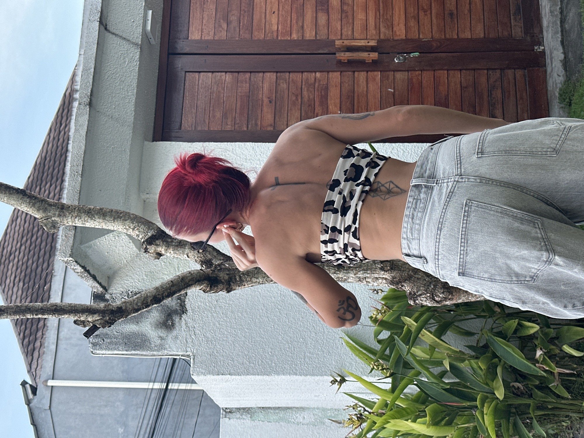 A woman with short red hair is wearing jeans and a bikini top, standing in front of a building with wooden doors